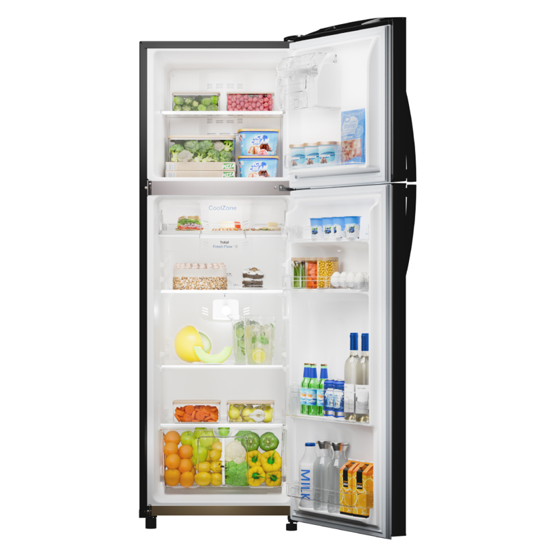 Heladera con freezer no frost. Color steel. Capacidad bruta de 300 litros. Deshielo automático. Sistema Total Fresh Flow. Estantes de vidrio templado. Anaqueles en puertas. Smart factory ice. Cajón para delicados y crisper XXL para frutas y verduras. Tecnología Energy Saver Green. Luz LED.